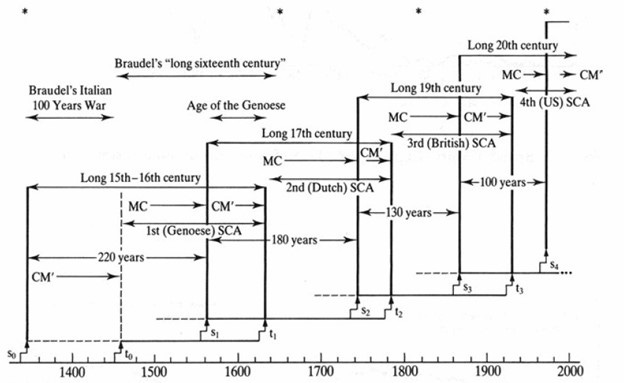 Chart: “Long Centuries and Systemic Cycle of Accumulation” by Giovanni Arrighi in The Long Twentieth Century (p. 364) (https://4.bp.blogspot.com/-KGqKvfJ0kW8/VuRFCNEA0FI/ AAAAAAAAAWQ/wEypk3LcDlsklqaAddTpILyv2ITat0bdg/s1600/SYSTEMIC%2BCYCLES%2BOF%2BACCUMULATION.jpg accessed 07Nov2021).